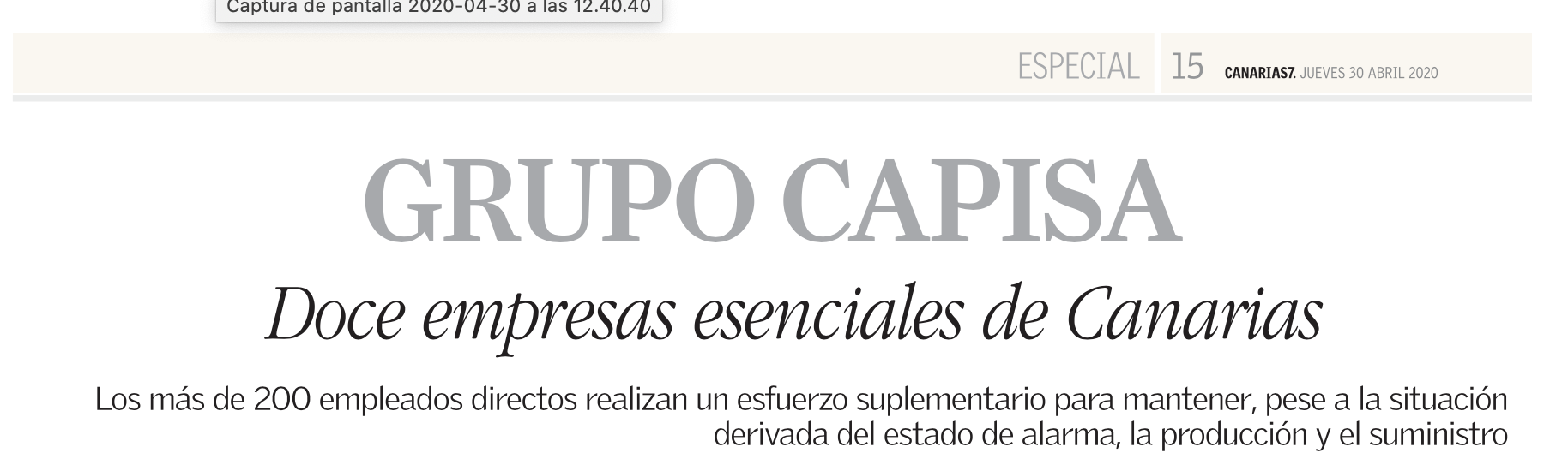 Canarias 7 destaca en su suplemento de sector primario la labor de Grupo Capisa durante el Estado de Alarma